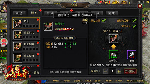 4、强化系统玩家朋友们可以通过回收装备、参加天关试炼、元宝商城等方法获取