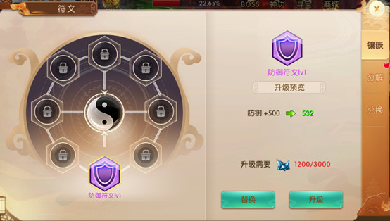 2、符文镶嵌符文的镶嵌需要通关深渊荡魔关卡,通关的层数越高,可以镶嵌的符文数量也就越多。同时镶嵌之后的符文还能通过符文精华来进行升级,升级之后属性也会随之提高。