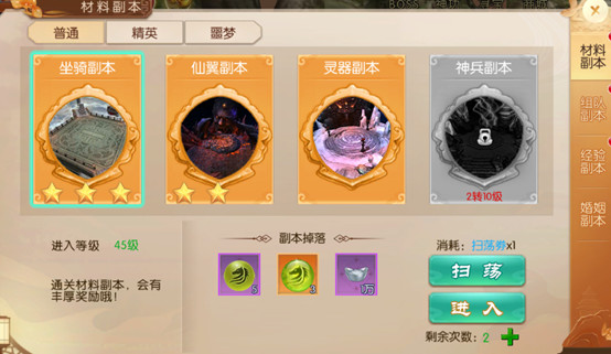二、材料副本材料副本能获得升级神器所需的材料,通过升级神器来提升自己的战力,材料副本分为普通、精英、噩梦三个难度,难度越高的副本掉落的材料越多,材料副本还有组队模式,难度比单人的要大上很多。是每天必做的副本之一。