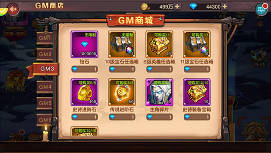 6、GM3商城无限购买钻石、传说英雄,每日购买大量钻石、大量金币、进阶石、主角碎片、传说装备等材料