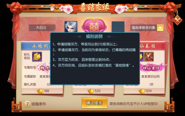 1.由希望结婚的一方在红娘处购买彩礼发起提亲,另一方同意后双方即可缔结姻缘,成为恩爱的仙侣;