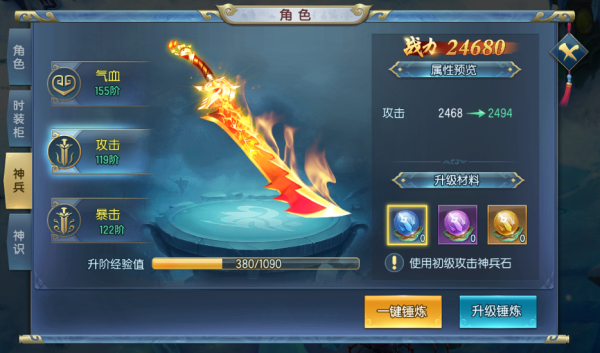 2、每种神兵拥有三种升级道具,分为初中高三个品阶;