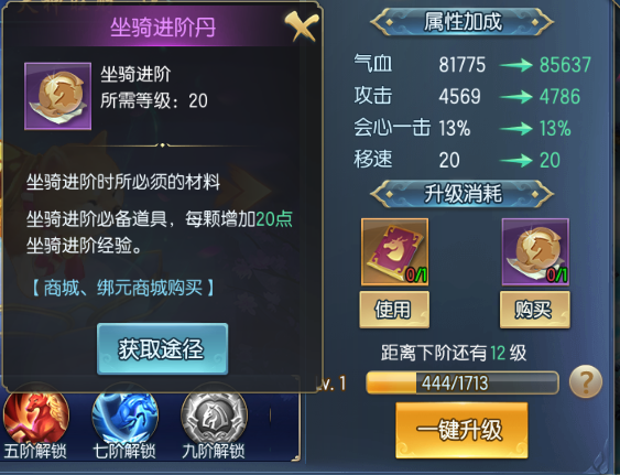 3、坐骑进阶丹可在商城购买或达成成就获得;