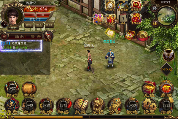 功能区域显示:排行、背包、角色、坐骑、翅膀、神器、技能、成就、公会、锻造、设置、拍卖、商城等界面的进入按钮;