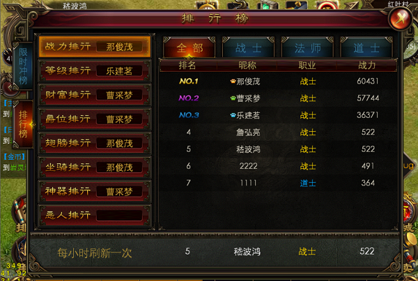 显示上榜玩家的排名,等级,职业,战斗力等信息