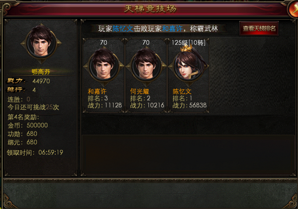 玩法:玩家自由进入竞技场进行排名争夺,击败敌方后可占有对方的排名名次