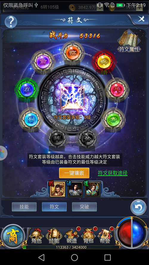 符文套装等级越高,合击技能威力越大,符文套装等级由已装备符文的最低等级决定,符文套装装备齐全时,符文套装等级为0级;