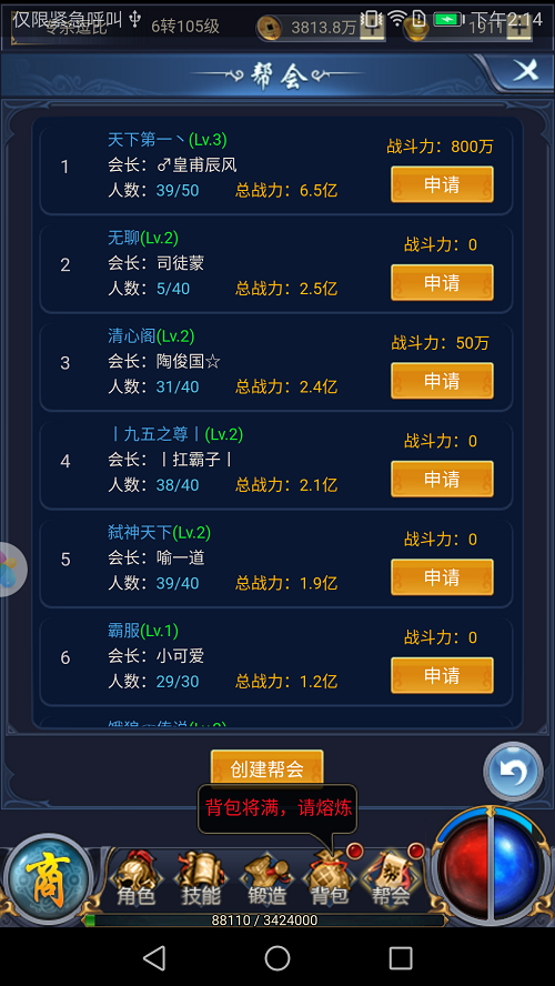 会玩法,点击主界面上的帮会按钮,可以打开帮会主界面。帮会系统开放后,玩家可以自己创建帮会,创建帮会需要消耗一定的资源,创建人自动是帮会会长。玩家也可以选择申请加入一帮会,加入成功之后默认是会员。