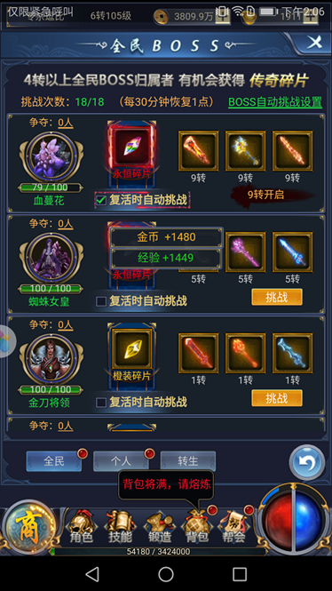 游戏的BOSS分为世界BOSS、个人BOSS、转生BOSS,在世界地图中还有几率会遇到随机BOSS;