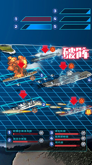 《钢铁舰队》是以五类战舰(驱逐舰、护卫舰、航母、巡洋舰、核潜艇)排兵布阵,进行战斗,虽然布阵虽重要,但更重要的还是战舰本身的品质。