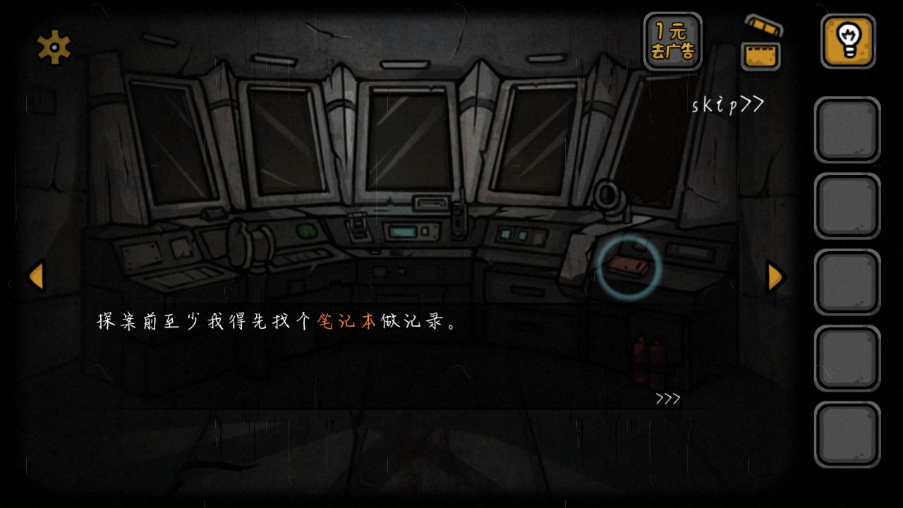 1、进入游戏首先得拿到这个笔记本,上图中发光的就是,然后点击中间的控制台,来下左边的拉杆打开灯光。