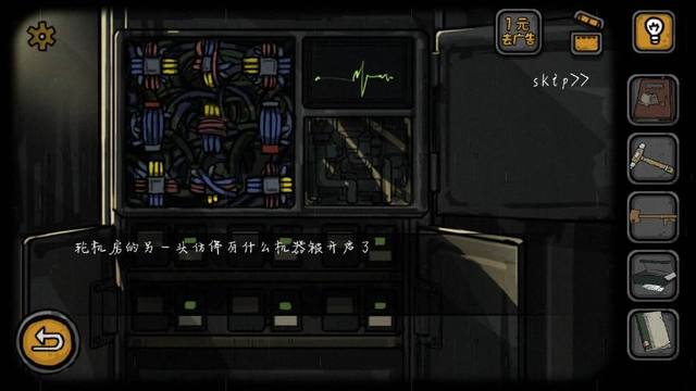 15.再次下到机轮室,根据图纸还原轮机房的九宫格(若实在解不开,时间一到就可以刷10个金币跳过);大阀门点2下,中阀门点5下,小阀门点3下(图纸上写的4:2的意思是有四个杆的阀门点2下,即大阀门点2下。);用钥匙打开蒸汽旁边的蒸汽机,刀片将尸体手套划开,得到关蒸汽的真正按键顺序12231(图纸上是忽悠人的),蒸汽关闭。