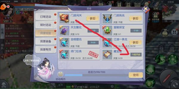 高手进阶:每日除了完成任务以外,玩家还可以参加活动,只需要点击画面右上方的活动即可,和以往普通手游不同,游戏里增加了各种限时活动,限时活动开放前会在右上角有提示,此类活动往往会有较高的经验及不错的装备或宝物等,玩家记得及时参加哦,同一活动会在每天24小时分段重复开放,记得是重复开放!重复开放!重复开放(重要的事情说三遍)!所以各位玩家不用担心时间上的问题,白天的活动在晚上一样可以参加,给您一个开放