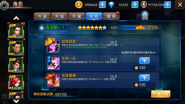 每位角色在初始的时候都自带一个必杀技能,该技能可以在战斗中作为怒气技能释放;此后,当每提升一颗星,将各获得一个被动技能。这些技能可以消耗技能点+金币进行升级,技能点每五分钟增加1点,最高可积累20点。