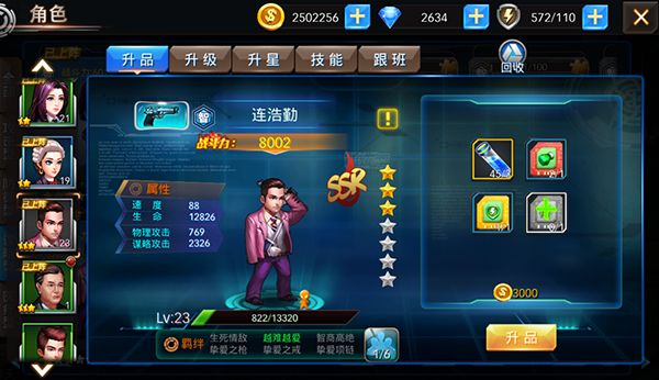 R-Rare【稀有】,颜色为蓝色,20个碎片可合成。SR -Super Rare【超稀有】,颜色为紫色,50个碎片可合成。SSR -Super Special Rare【超级特别稀有】,颜色为橙色,100个碎片可合成。目前SSR较难获取,除了抽角色外,只能靠刷碎片和买碎片来合成。可以先追求SR阵容,再慢慢替换为SSR。这里安利一下首充6元就能获得的SSR“连浩勤”,必杀技是群体攻击,无愧于SSR最强输出之名。当玩家在编队时,奶妈,物理输出,谋略输出,肉盾尽量都带一个,遇到战胜不了的敌人,多观察一下敌方角色的站位,根据技能释放位置针对进行站位,便可以将主力输出和奶站到最后,让伤害最大化!了解了角色的基础类型,我们还要知道如何对角色进行强化和养成,好让他们在战斗中发挥最大的作用,下面着重讲解如何提升角色的战力。