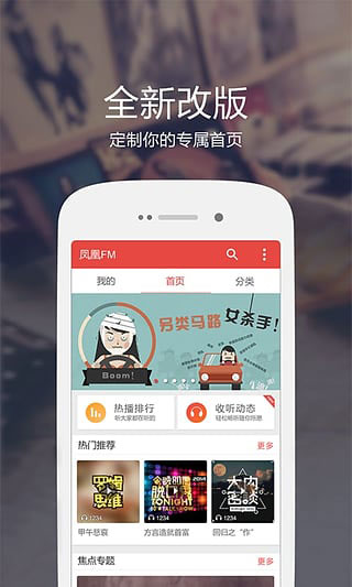 凤凰FM是凤凰网推出的一款手机音频应用,可以收听凤凰卫视、凤凰U Radio、音乐、畅销小说、童话故事、评书相声、公开课等多种类型的节目,包括资讯、访谈、娱乐、社会热点话题等各种音频和图文内容。并有收视金牌节目音频集合,Podcast — 精彩内容,随选随听,同时支持直播、点播、离线收听等多种方式。