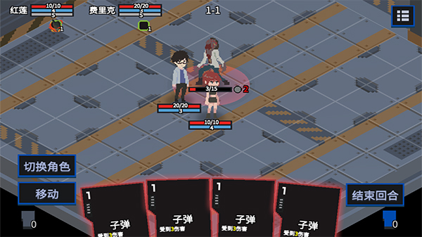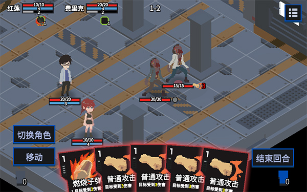 3.使用“切换人物”来控制不同角色,点击“结束回合”之后就轮到敌人行动了,灵活安排战术来战胜敌人。