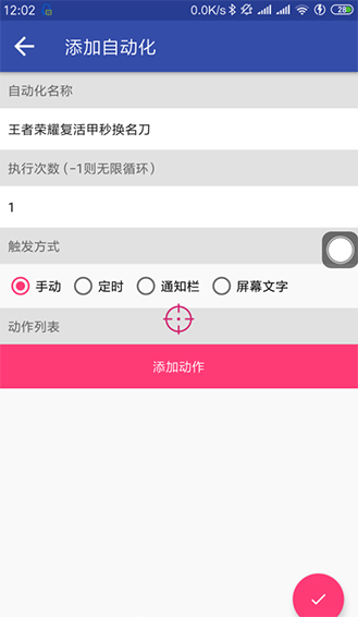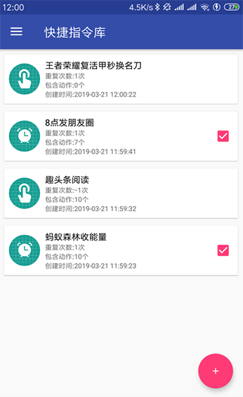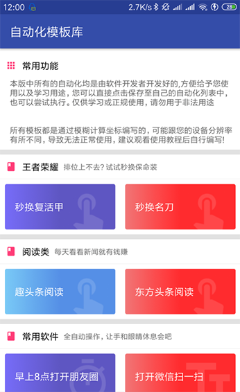 社交软件提供快捷操作帮助,而且还具备脚本自动操作、编写、导出分享的一款强大应用软件!这款软件还可以用在王者里秒换复活和名刀(手速不够,软件来凑)、趣头条以及东方头条帮你快速赚钱,快速打开微信扫一扫以及蚂蚁森林能量快速收集等等很多地方,很方便也很实用,里面有很多例子教你怎么操作,以你们的聪明才智我相信你们百分百分分钟就会玩。而且一触即发app不仅有针对微信和qq打造的功能,还有悬浮窗设置、一键截图等很多很多内容哟!如果有对其感兴趣的朋友那还不赶快来下载试一试吧,一起体验在游戏里面手速超快的感觉!