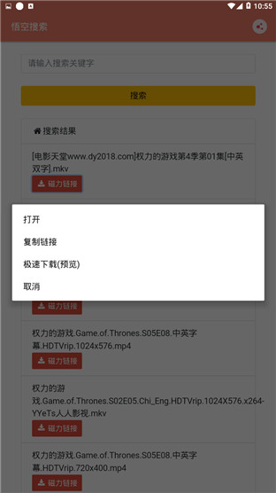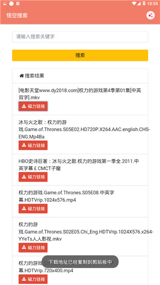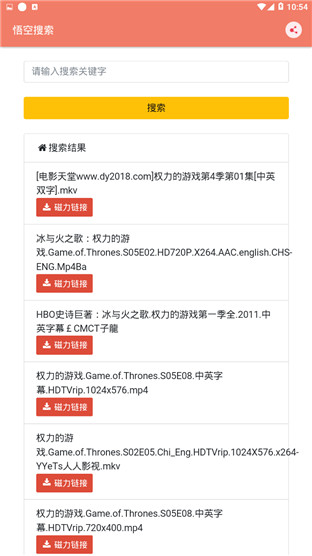 悟空搜索是一款功能十分强大的搜索应用,它可以帮助你进行各种影视剧资源的搜索,搜索结果秒出。资源提供下载服务,可用应用自带的下载器或者采用第三方的下载方式。应用十分小巧,功能单一但是很强大,一秒就可以出所有相关的结果,可以说是十分快捷了,喜欢看剧的朋友千万不要错过,无论是国内的还是国外的,你想看的都能直接搜索到资源,速度超快。汇聚了全网的资源,你可以自由的进行影片的查找,院线热映的你也可以直接尝试搜索,自动为你过滤可疑文件,让你少遭遇假包,获得更好的搜索体验。作为一款专注于影视剧搜索的应用,它可以为你解决所有有关影视剧资源来源的问题,所有的资源一手掌握,想看就看,从此不求人,实时获取最新资源。修改说明:去除所有限制,免除所有广告