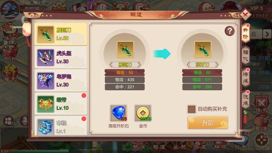 2)装备升阶需要消耗升阶石进行提升,升阶一定等级可提升一档装备品质颜色,并改变装备名称和图标,同时提高属性值。