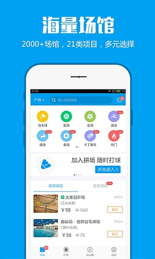 还提供3000+运动场馆的线上预订服务。订场服务已覆盖广州、深圳、北京、上海、天津、杭州、青岛、东莞、佛山等38个主流城市,1000000+场地,21项运动(羽毛球、篮球、足球、游泳、健身房、卡丁车等)应有尽有,各种特价订场优惠,尽在趣运动!