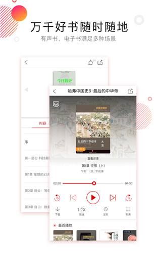 阅读软件,这里有着许多的有声书籍,精品课程,能随时随地的阅读一本好书。这里汇集乐丰富的图书资源,用户可以在线看书,并且支持听书,为用户带来各个方面的知识,喜欢阅读的朋友们在这里一定会收获很多,不断的提升自己的水平和能力。每天都会精心为你推荐图书,满足不同用户的需求,利用你零碎的时间来学习理解更多的知识。在我们快节奏的生活中,能静下来阅读一本书是非常开心的一件事情。软件中拥有100本经典的有声书,2000多本电子书持续在更新,所以用户不用担心没有书看了,无论是情感,文史,自传,生活,校园,青春,政治等应有尽有,包含了理财、创业、文史等多个方面,能让你快速的提高自己的知识量,同时在这里你还能认识很多的小伙伴们,一起探讨,一起学习,一起聊聊书籍都是非常不错的哦。喜欢的用户可以来本站下载中信书院哦!