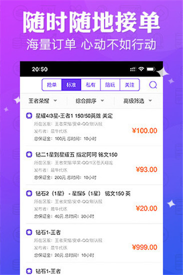 王者荣耀、英雄联盟、QQ飞车、刺激战场等热门的电子竞技游戏,有兴趣的用户可以来试试效果如何。玩家在这里事先将费用存到钱包中,然后等代练结束后会将应付的费用转给代练师,让你体验到不一样的支付方式。有需要的小伙伴可以来下载哦!