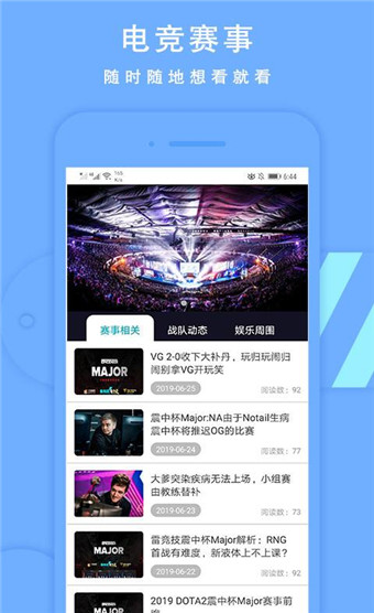 2、现场直播,第一时间跟踪所有的游戏电竞比赛,直播方式让你直击精彩比赛
