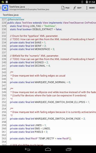 文本编辑器或者代码编辑器。Text Editor是Android安卓手机上一款功能非常强大的手机文本编辑器软件,完美支持中文,可以替代Jota+文本编辑器,Text Editor安卓手机文本编辑器不仅支持安装于手机上,还支持安装于平板电脑上,显示效果非常好。QuickEdit文本编辑器是Android上的高效,稳定和全功能的文本编辑器。它同时为手机和平板设备进行了优化。增强型的记事本应用,包含大量增强和升级。代码编辑器,可为超过40种的编程语言进行语法高亮。高性能,实时的反馈,可以在处理大型文本文件(超过10,000行)时流畅编辑,需要的用户朋友们快来下载试试吧。