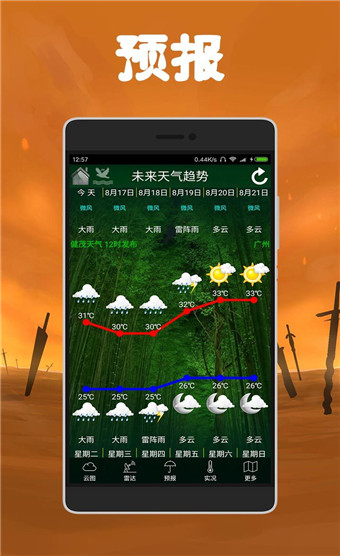 天气预报软件,该软件能够为用户详细介绍当天的天气情况以及未来几天或则是十几天的天气情况等等,非常的方便了用户出行。这款软件支持两千多个县级以及以上的城市天气情况预报,并且支持一周内用户所在地的气温趋势图、实况温度计动画显示以及风向风力盘图等,该软件专注于通过图片的形式来为用户展示天气情况,更加的简洁明了。健茂天气app内的各种天气情况消息都是采用来自中国天气气象网的数据,所以非常的准确,用户可以放心使用。在这里你可以看到当天的气温、湿度、空气质量等多方面信息,还能够提醒用户增减衣物、携带雨伞等,还能够预报台风的走向以及登陆地点以及风力指数等等,能够让在沿海城市的居民提前做好抗台风的准备,一面造成不必要的损失。总而言之在这里用户能够看到非常多的详细天气情况信息,有需要的用户可以来本站免费下载哦!
