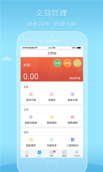 好律师律师版是专门面向律师的平台,入驻平台之后,你可以直接使用这款应用来进行管理。在线可直接进行委托人的订单接取,并且可以与委托人进行语音视频等,尽快获取到有用信息,并开始起草文件,准备应对接下来的问题。你可以直接在平台上查询可接取的订单,帮助委托人进行起草合同、审核合同、快速立案开庭等。可添加自己的电话号码在平台,方便委托人在进行委托的时候可以通过电话直接进行联系。这是一个可以让委托人和律师直接一对一进行交流的平台,作为好律师,需要经过认证和审核之后才能进行订单的接受以及参与与委托人的讨论和交流。作为一名合格的律师必须要有足够的耐心,遵守平台的规定才能在这里展开业务,为委托人进行服务。