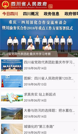 中国四川app安卓版是一款专门为四川本地的市民提供各种相关的资讯服务的应用,在这里你将能够直接查看所有与四川相关的政治资讯以及各种头条,并且将会把最新发生的新闻时事,实时随你进行报道,让你可以更加轻松的掌握更多的有关于四川的信息,了解到更多四川相关的资讯新闻,并且从中获取到更多的有效的信息,时时刻刻关注自己的城市,了解到本地更多的变化。每日都会为你进行海量的优质资讯推送,领导重要谈话以及四川的各项项目的实施等信息,你都能够迅速的通过应用来进行了解。除此之外你还能够通过这款应用,来进行四川的地理位置以及自然状况的信息查询。中国四川app应用内还有多个可以提供浏览的板块,每个版块都将会有专门的人进行负责更新,优质的内容一定能够满足你的阅读需求。