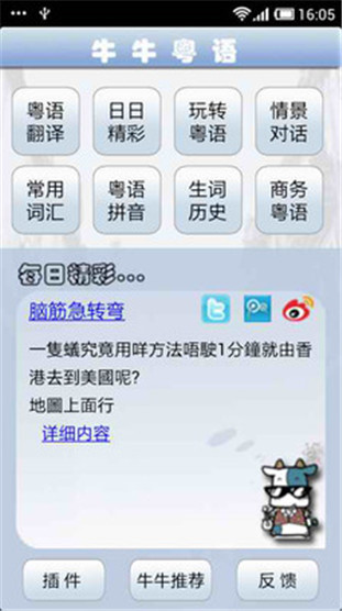 牛牛粤语最新版是一款非常有趣的粤语学习软件,在这里你可以进行最为正宗的粤语发音的学习,内置汉语粤语对照翻译字典,用户可以轻松的完成对粤语的学习。拥有情景对话、生词历史、上午粤语等各种功能可以进行选择,用户可以自由的挑选最为合适自己进行学习的粤语。作为一款进行语言学习的软件,它可以让你零基础都能直接进行粤语的学习,简单的使用方式加上每一个字都会标注上用来学习的罗马音,将会以更好记,更好学的方式让你来进行粤语的学习。
