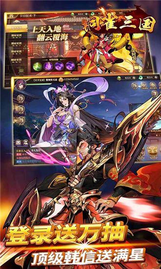 铜雀三国手游安卓版是一款包含了策略以及角色rpg在内的国战类手游,游戏采用了Q版人设,将里面的所有人物全部萌系儿童化,带给所有玩家眼前一亮的心动感哦。游戏发生于东汉末年,各地纷争遍起,乱世初现,群雄个个占地为王,都想一统这乱世,称霸为王。其中尤以曹、刘、孙三家为大,三国鼎立。玩家进入游戏后首先就得在这三个国家做出一个选择,选择自己喜欢的国家加入,加入后就要开始建立起自己的势力了。玩家首先要根据系统的提示来为自己建造一个属于自己的城池,然后在里面训练自己的士兵以及招募自己心仪的将领,当然出兵打战所必备的粮草也是必要的。