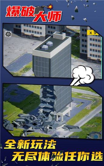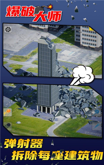 爆破大师是一款休闲解压类手机游戏。游戏中采用了3D建模设计,精致细腻的画面场景,以及非常逼真立体的场景,为大家带去最真实的游戏体验。开放式的玩法模式,十分的新颖多样,你可以在这里任何的选择自己喜欢的武器,还有各种各样的游戏道具。在这里,你可以尽情的释放自己,对这座废墟城市进行肆意的破坏,对那些大楼进行爆破,摧毁一座又一座的大楼,享受其中超级解压的快感。其中,游戏的背景以及破坏能力,将带给玩家更加逼真刺激的体验。这里小编为大家带来的是爆破大师手机版,趣味性的闯关冒险挑战,超多的魔性关卡都能挑战。你可以根据自己爆破的地点,悬着何时的炸药,在有限的时间里尽可能的破坏建筑物,十分解压的模拟拆楼过程等你体验,玩家摧毁所有大楼即可成功过关!