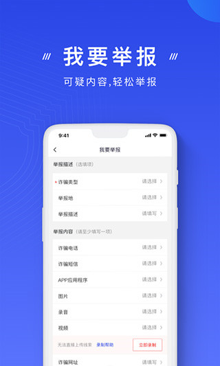 5、通过这个软件可以快速的举报诈骗内容帮助他人提前防范,还是可以一键开启录屏录音,上传诈骗线索。
