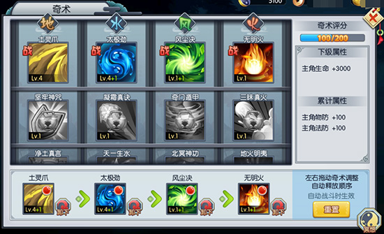 强化中的奇术系统,达到激活条件后激活对应的奇术,共分为地、风、水、火四系,是战斗中十分重要的一部分。不同奇术有各种效果,例如造成伤害、控制敌方、增加攻击、吸收伤害等等。奇术可通过消耗道行提高奇术等级,高等级的奇术有更强的效果和命中率。