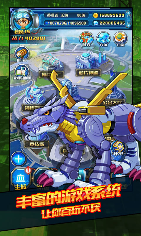 天天数码兽手游官方版是一款由动漫《数码暴龙》改编的冒险手机游戏。游戏采用放置冒险的形式,搭配同伴羁绊卡牌系统,经典重现《数码宝贝》的动画剧情。同时拥有丰富的数码兽究级进化体系,打造属于您的数码兽战队与它们并肩作战,让您重温儿时的热血与梦想。游戏为玩家准备了任务广场系统,玩家在这里完成每日任务和主线任务,闯关成功就能够获得闯关奖励哦!数码暴龙兽百分百原著复刻,重燃二次元热血,提供神秘的羁绊系统,让您的数码兽获得超凡能力,丰富的游戏系统,让你百玩不厌,竞技场、神秘商店、插件工厂、芯片神殿、公会大厅等,应有尽有,你想找的都在这里,超激烈的公会战,体验超刺激的PVP玩法,数码兽究极进化,三十六种不同搭配,这款好玩的游戏等你来挑战!