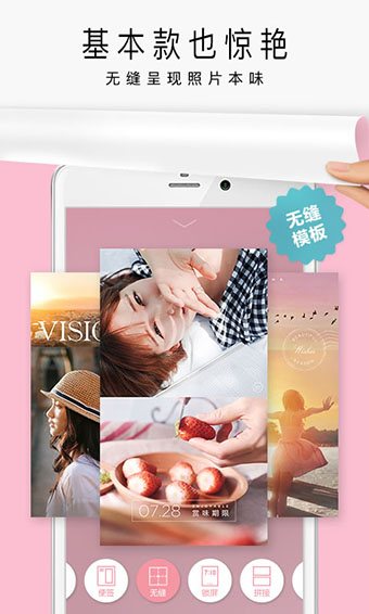 简拼有四种形式:简约、便签、拼接和明信片,爱怎么拼怎么拼,每一种形式出来的效果都是高逼 格的,分分钟让你变修片高手,每一张照片都仙气十足,瞬间变女神啊有木有!简单的拼凑,让每一张普通的照片说出自己的心声。