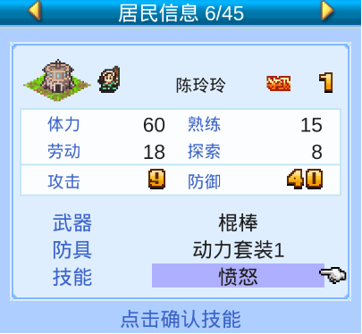 5、居民的劳动力越高,生产的效率越快,后期除了战斗人员升级外,其他居民也可适当的升级,以提高“劳动”属性跟进生产;
