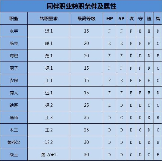 各职业精通技能一览在大航海探险物语最新版本的世界里,每当同伴满级,都会获得当前职业的特有技能(永久获得且转职后依然保留,但需要装备该技能后才生效)。这些技能有些什么效果呢?快看看下面的技能效果表吧!