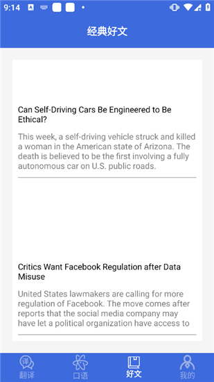 软件中有着丰富的英文常用语句和经典好文,让用户能通过软件学习自己的英语水平。