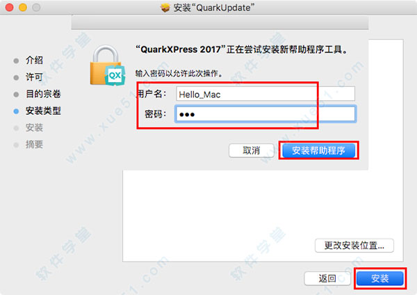5、让后软件就会弹出一个窗口需要输入用户名和密码, 用户名“hello_mac”输入您的mac电脑密码,然后点击安装“帮助程序”。