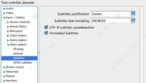 2、依次选择Preferences窗口左边菜单框的Input / Codecs -> Other codecs -> Subtitles,将右边的设置区中Subtitles text encoding设置为GBK,同时取消UTF-8 subtitles autodetection前面的勾,然后确定.