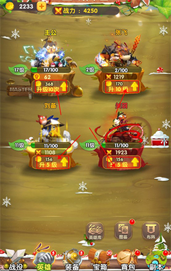 玩家除了给英雄升级提升战力,还可以通过装备来增强战斗力,玩家可以点击下方的装备,使用宝石即可强化装备,增加整体的战斗力。