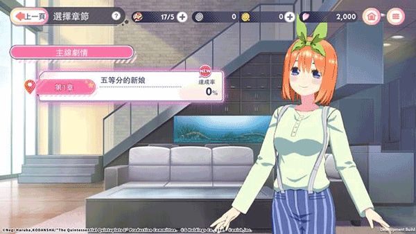 五等分的新娘手游汉化版是一款超人气动漫改编的恋爱养成手游。游戏中,玩家将扮演男主上杉风太郎,体验原作剧情,与一花、二乃、三玖、四叶、五月产生邂逅,进行一场场浪漫的约会,与她们进行不同的愉快日常生活,产生深深的羁绊。该游戏不仅完美的还原了动漫中的人物角色形象和特色,还引入与大多日式RPG类似的养成、进阶、突破等系统,玩家需要对自己的角色进行养成。
