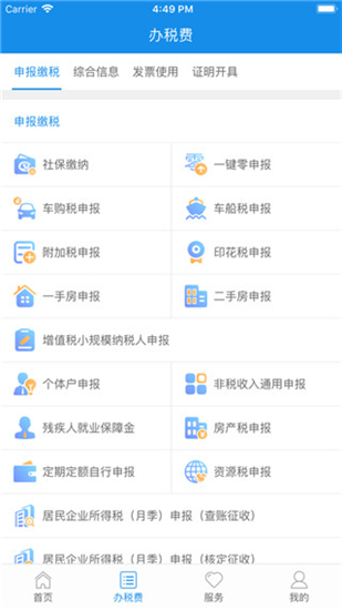 而且平台还提供了社保费缴纳、车购税缴纳、车船税缴纳、增值税普通发票代开、增值税专用发票代开、一键零申报、增值税小规模纳税人申报等多种生活缴费服务功能,很好的为纳税人、缴费人提供了更为高效、便捷的办税费体验,有需要的朋友不妨来下载试试~