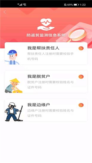 4、进入注册界面,这里有两种身份可以选择:【帮扶责任人】和【脱贫户、易返贫致贫户】。我们根据自己的身份进行相应的选择注册即可。
