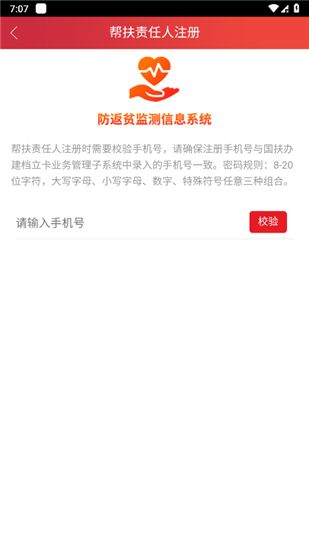 5、在【帮扶责任人注册】页面,先输入手机号,然后点击校验,确保注册手机号与国扶办建档立卡业务管理子系统中录入的手机号一致后,再按照指引完成注册操作。