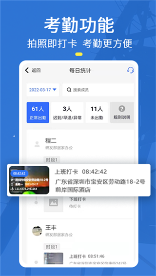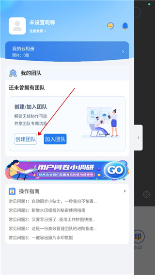 在元道经纬相机软件中,用户还可以在这里创建团队,将拍摄的图片上传至团队云相册,这样团队中的人都可以使用图片,此外,团队中还有着故障上报,资产盘点,考勤打卡,组织架构等功能,能够帮助团队提升工作效率。